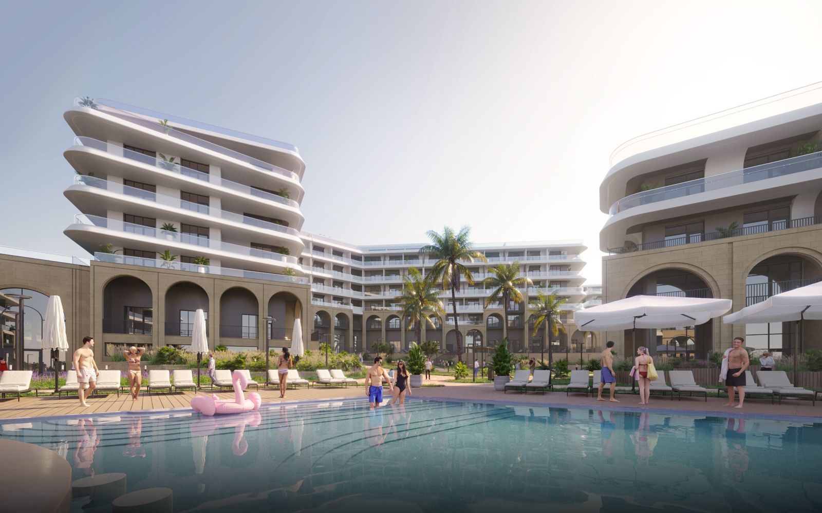 Открытые бассейны с подогревом, зонами загара и летим баром