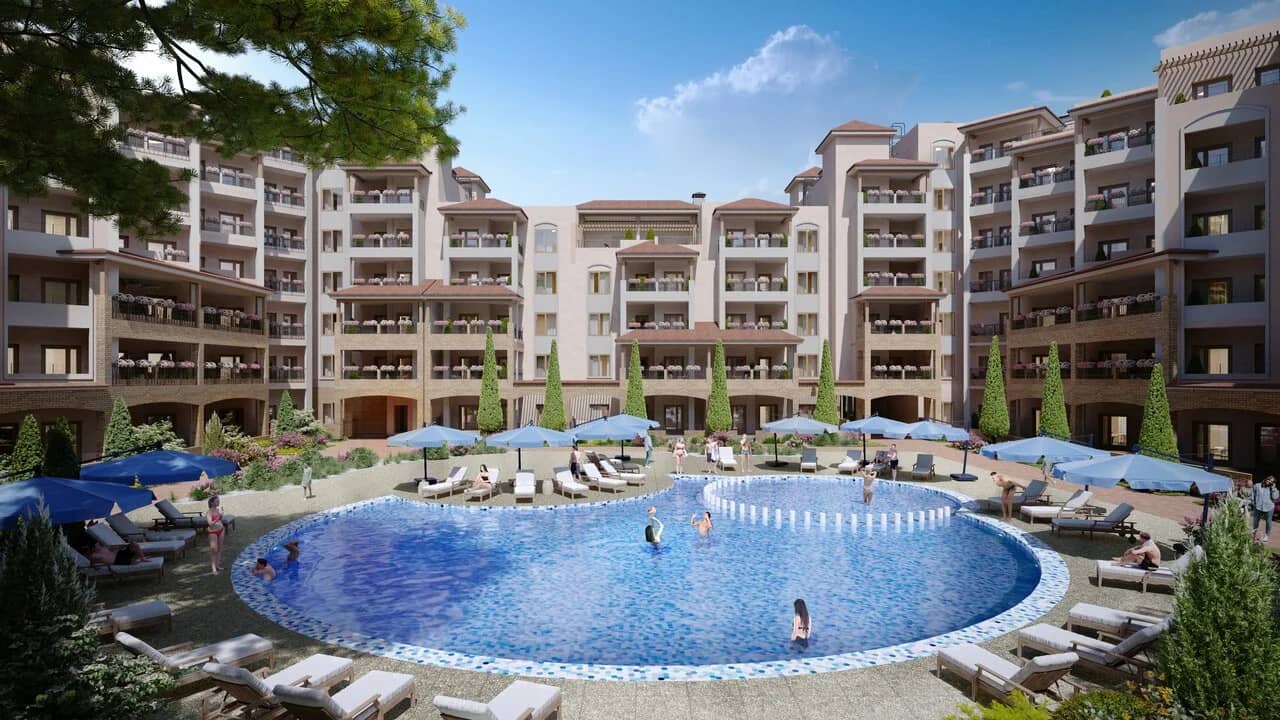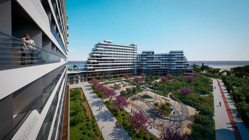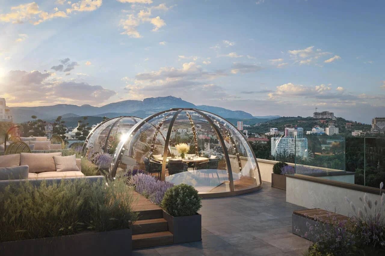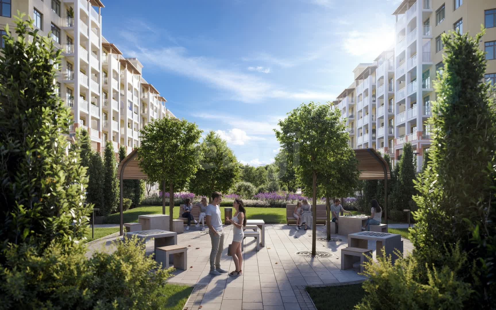 Закрытая благоустроенная охраняемая территория с прогулочным променадом, фонтанами, амфитеатром, зонами для отдыха, гриль-домиками и велодорожками, концепция "город в городе", парк-сад с бассейном, ресторанный дворик, детские и спортивные площадки, консьерж-сервис 24/7, разнообразная коммерция на территории - всё для Вашего комфортного отдыха и проживания на курорте, а также получения достойного инвестиционного дохода.