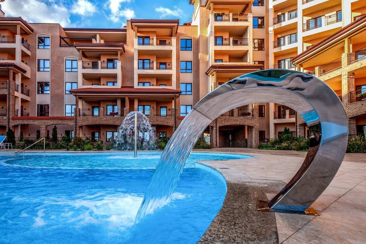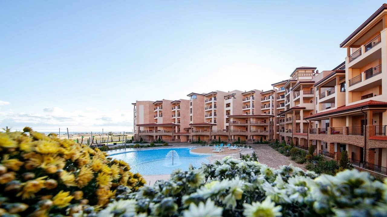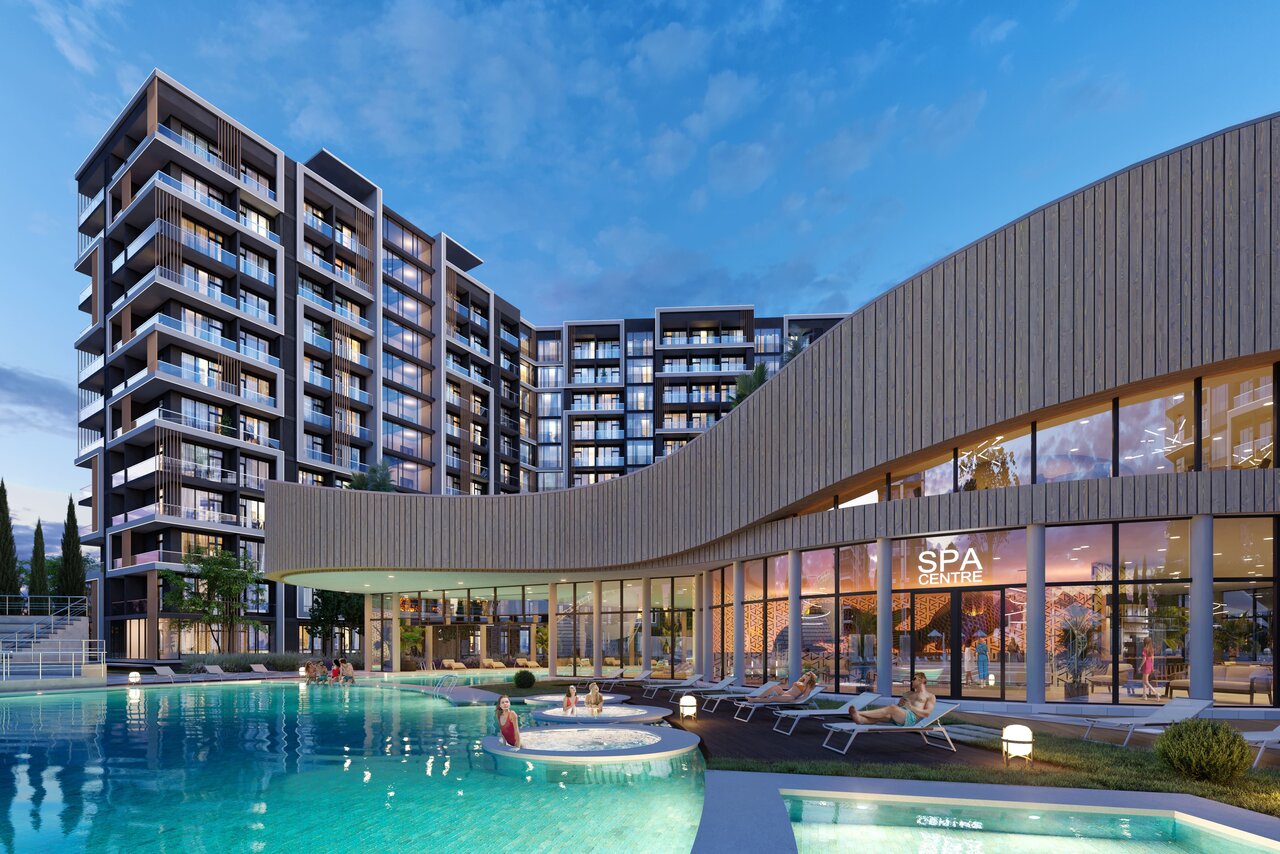 Закрытая благоустроенная охраняемая территория с прогулочным променадом, фонтанами, амфитеатром, зонами для отдыха, гриль-домиками и велодорожками, концепция "город в городе", парк-сад с бассейном, ресторанный дворик, детские и спортивные площадки, консьерж-сервис 24/7, разнообразная коммерция на территории - всё для Вашего комфортного отдыха и проживания на курорте, а также получения достойного инвестиционного дохода.